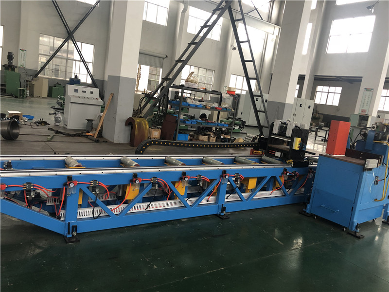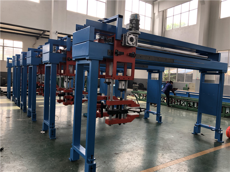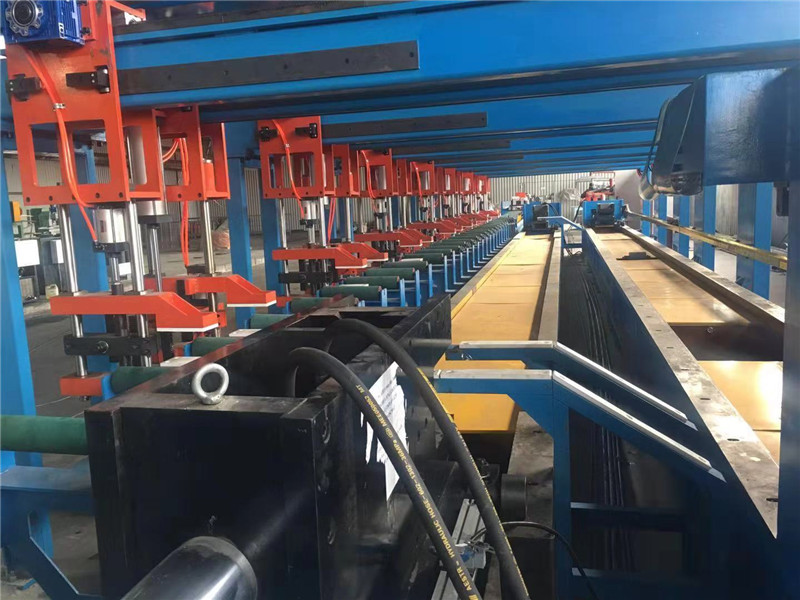 中心移動排料→中心定位→牽引,矯直→中心導向→成型→液壓牽引→牽引切割→夾緊轉移→自動轉移→張力矯直→自動轉移→定長切割→自動排料→成品庫存