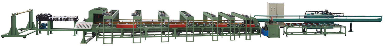 銅排制頭;放卷;矯平輸送;鉗口夾緊;潤(rùn)滑;拉拔;中斷鋸切;橫向移料;張力矯直;橫向移料;輥道輸送;定尺鋸切;輥道輸送到儲(chǔ)料臺(tái)