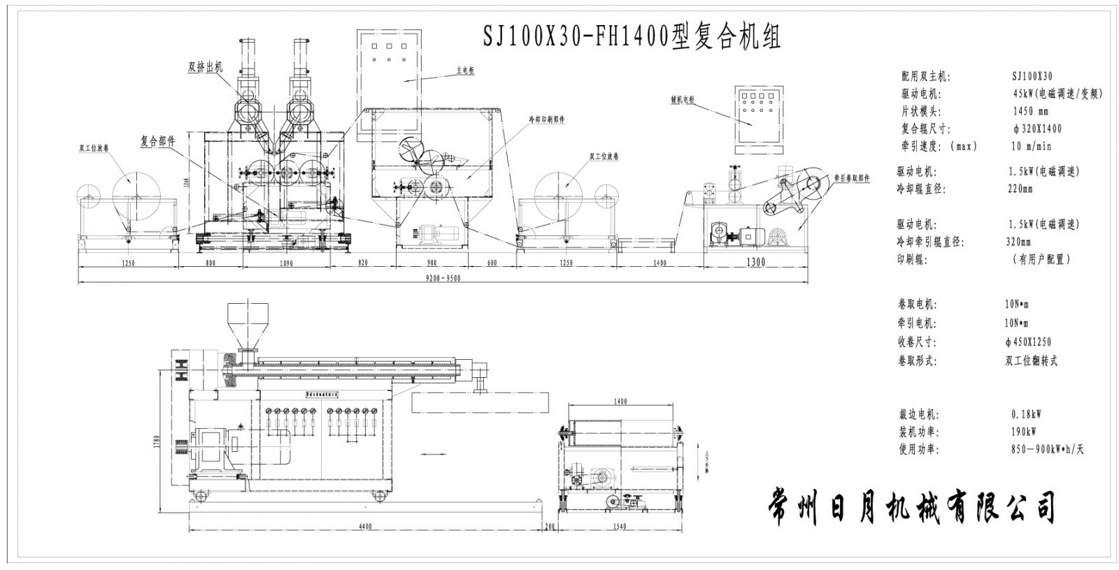 6. 整機設(shè)備配置:1、SJ100/100×30塑料擠出機1套(2臺),(帶1750mm規(guī)格雙模頭液壓快換過濾網(wǎng)裝置),2、復(fù)合裝置1套,3、雙工位放卷架2套,4、冷卻膠板印刷裝置1套,5、切邊卷取裝置1套(雙工位翻轉(zhuǎn)式),計米器帶定長報警裝置,氣漲軸2根,***1把。